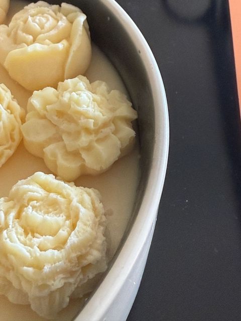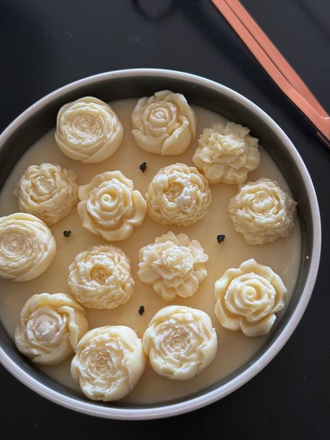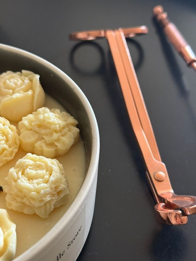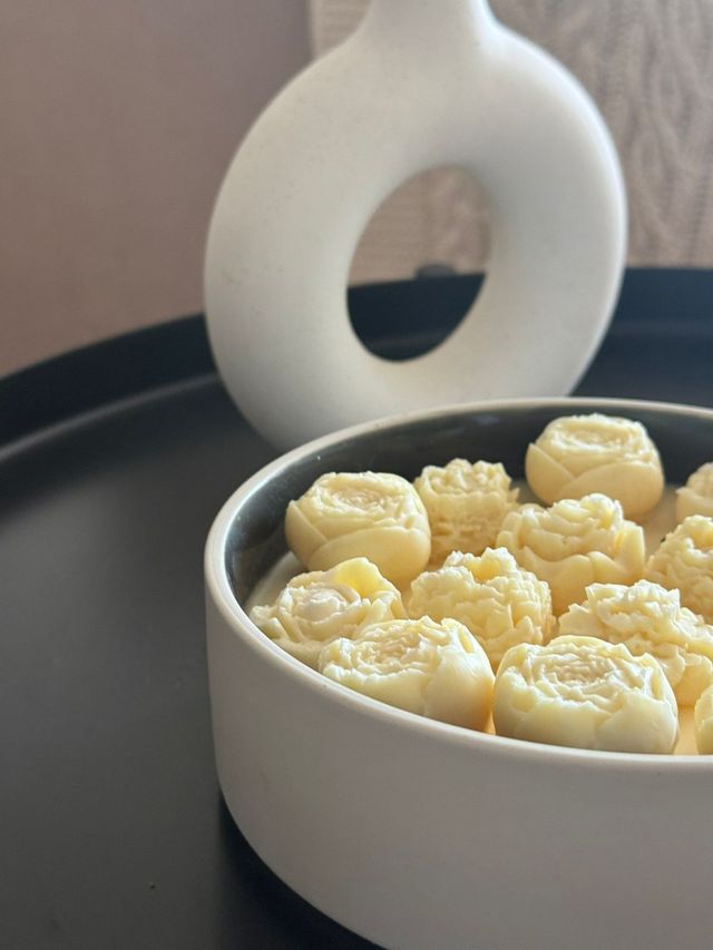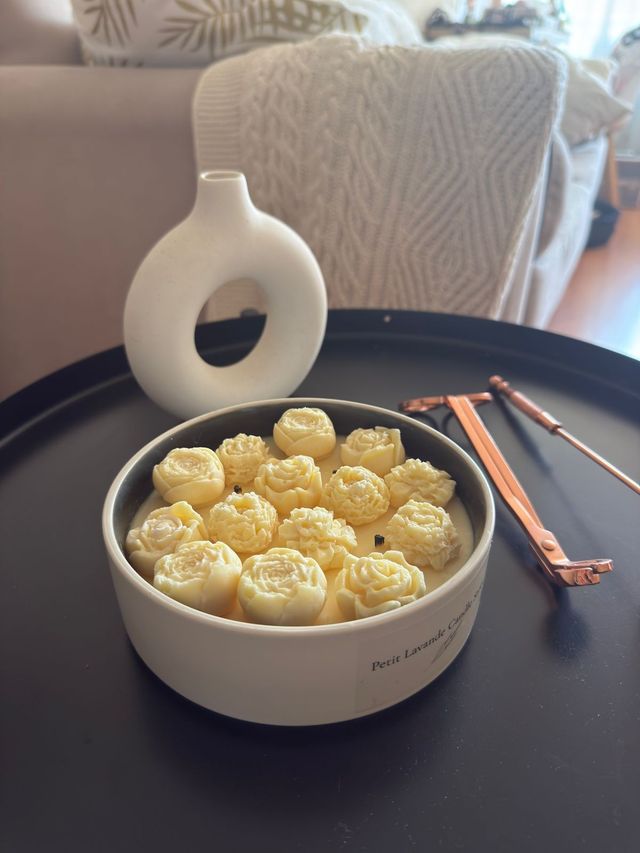 Candle Bowl es nuestra nueva vela en cera de soya con apliques de pequeños pimpollos en la superficie en un bowl de ceramica beige.